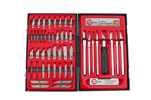 Набор скальпелей для фигурной резки по дереву. Для более точного оформления резки по дереву в наборе доступны несколько различных по форме лезвий, изготовленных из высокоуглеродистой стали. Каждое лезвие способно задавать некоторые формы и грани на обрабатываемом объекте. Для более тонкой и мелкой работы возможно использование менее тонких лезвий и заостренных на конце. В набор входят 56 ед.: острые бритвенные лезвия различных форм и размеров - 39 шт.; шило - 8 шт.; держатели - 8 шт.; точильный камень, пластиковый футляр для хранения. Комплектация: Лезвияшилодержателиточильный каменьпластиковый футляр; Количество лезвий: 39 ед. Вес, кг - 0.7 ; Дополнительно - Комплектация: Лезвия; шило; держатели; точильный камень; пластиковый футляр, Количество лезвий: 39 ед. ; Количество, шт. - 56 ; Материал - Сталь ; Производитель - Intertool ; Страна производитель - Китай ; Тип - Набор скальпелей ; Упаковка - Пластиковый футляр ;