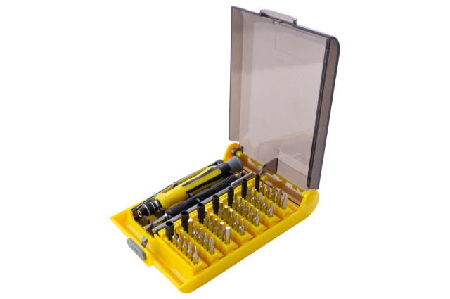 Отвертка прецезионная со сменными (M2.5, M3.0, M3.5, M4.0, M4.5, M5.0, M5.5, SL1.0, SL1.5, SL2.0, SL2.5, SL3.5, T3, T4, T5, T6, T7, T8, T9, T10, T15, T20, PH000, PH00, PH0, PH1, PH2, H0.9, H1.3, H1.5, H2.0, H2.5, H3.0, H3.5, H4.0, U2.0, U2.5, ►2.0, ►2.3, *2.0, •1.0) битами и двумя удлинителями (один гибкий) в пластиковой коробке. Количество, шт. - 45 ; Особенность - Прецизионная ; Производитель - Miol ; Размер - M2.5-5.5/SL1.0-3.5/T3-20/PH000-1/H0.9-4.0/U1.0-2.5 ; Страна производитель - Китай ; Тип - Отвертка ; Упаковка - Пластиковая коробка ;