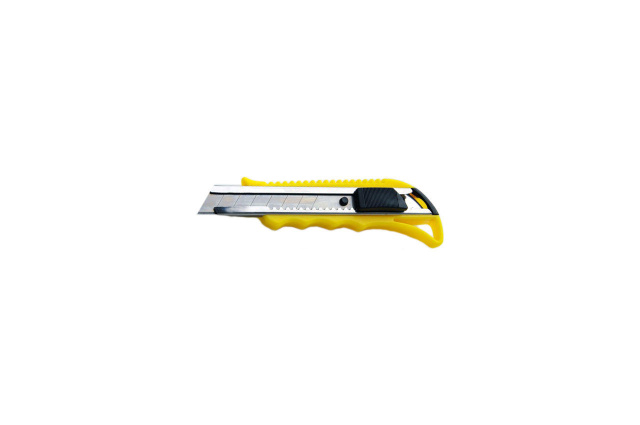 Нож выдвижной с металлической направляющей, автозамок. Материал корпуса - пластик. Материал корпуса: пластик; Материал корпуса: пластик; Материал лезвия: Инструментальная сталь; Механизм блокировки лезвий: металлическая направляющая, автозамок Вид - С автозамком ; Длина лезвия, мм - 100 мм ; Длина полотна, мм - 100 ; Производитель - Сила ; Страна производитель - Китай ; Тип - Нож ; Цвет - Желто-Черный ; Ширина лезвия, мм - 18 ; Ширина, мм - 18 ;