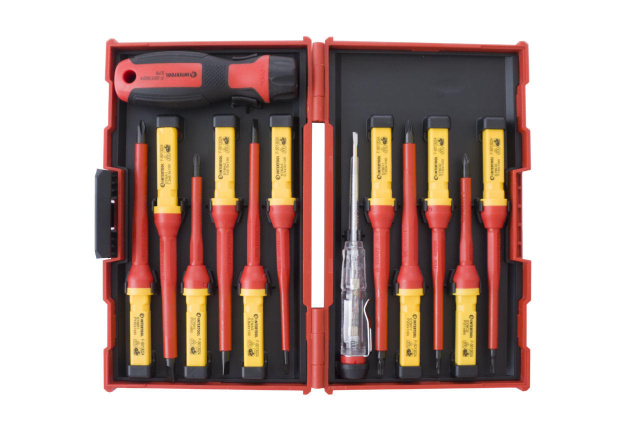Диэлектрическое покрытие стержней отверток обеспечивает полную защиту от поражения током, изолированные рукоятки с удобным хватом для надежности проведения работ. Предназначены для работ с крепежами, находящимися под напряжением до 1000В. Прошли заводской контроль качества на сертифицированном европейском оборудовании. Изготовлены из Cr-V стали. Комплектация: Отвертки: SL0.5*3.0*100мм, SL0.8*4.0*100мм, SL1.0*5.5*100мм, SL1.2*6.5*100мм, PH1*80мм, PH2*100, PZ1*80мм, PZ2*100мм, T10*100мм, T15*100мм, T20*100мм; индикатор; держатель; кейс. Количество в наборе: 14 ед.; Рабочая длина: 100 мм; Напряжение: 1000 В Вес, кг - 0.817 ; Дополнительно - Тип: диэлектрические, Количество в наборе: 14 ед., Тип насадок: SL0.5*3.0, SL0.8*4.0, SL1*5.5, SL1.2*6.5, PH1, PH2, PZ1, PZ2, T10, T15, T20, Рабочая длина: 100 мм, Напряжение: 1000 В ; Производитель - Intertool ; Размер - SL0.5*3.0, SL0.8*4.0, SL1*5.5, SL1.2*6.5, PH1, PH2, PZ1, PZ2, T10, T15, T20 ; Страна производитель - Китай ; Тип - Набор отверток ;